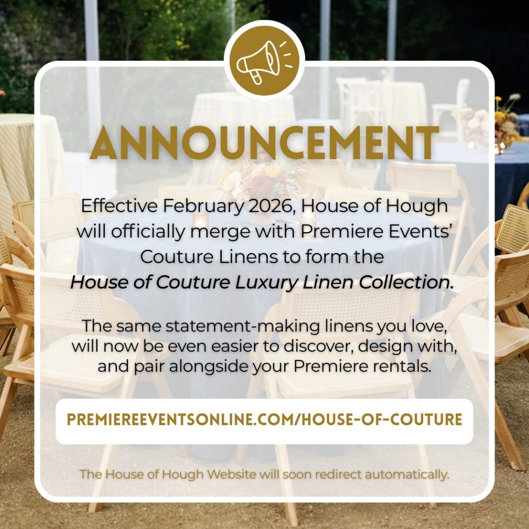 Whether you’re placing a standalone linen order or adding House of Hough linens to an existing Premiere Events rental, our collection is available to suit your needs with ease and elegance. Every detail matters, and with House of Hough, your tabletop will be nothing short of extraordinary.
